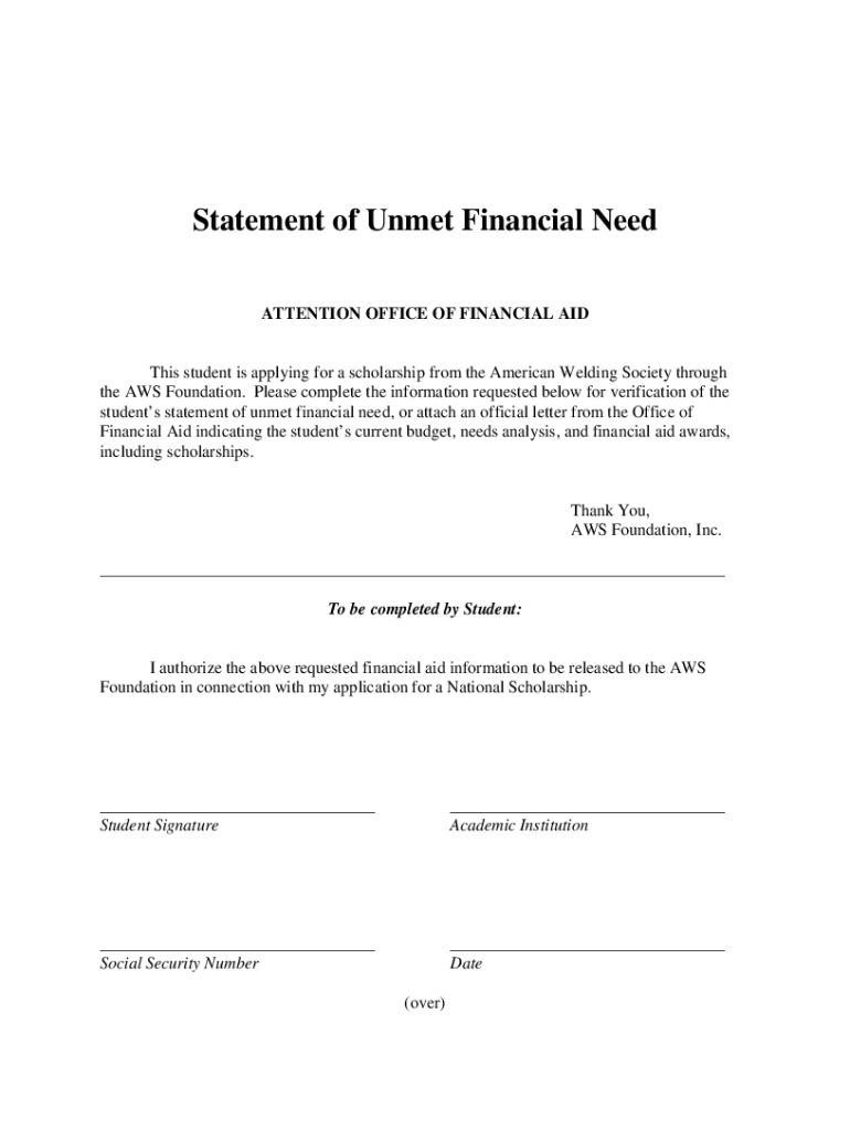 Statement of Unmet Financial Need ATTENTION OFFICE OF FINANCIAL Widths' student is applying for a scholarship from the American Welding Society through the AWS Foundation. Please complete the information