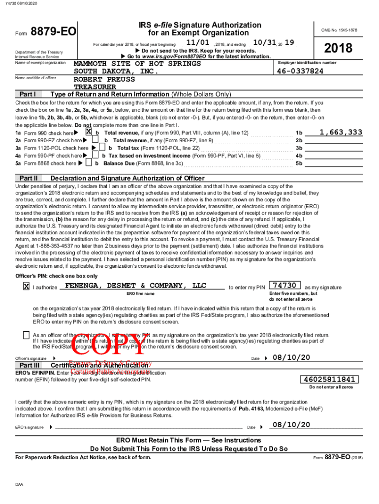 74730 08/10/2020Form8879EODepartment of the Treasury Internal Revenue Service Name of exempt organizational and title of officerPart AIRS file Signature Authorization for an Exempt Organization For