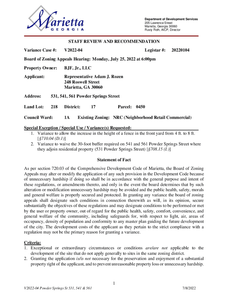 Department of Development Services 205 Lawrence Street Marietta, Georgia 30060 Rusty Roth, ICP, DirectorSTAFF REVIEW AND RECOMMENDATION Variance Case #:V202204Legistar #:20220104Board of Zoning Appeals