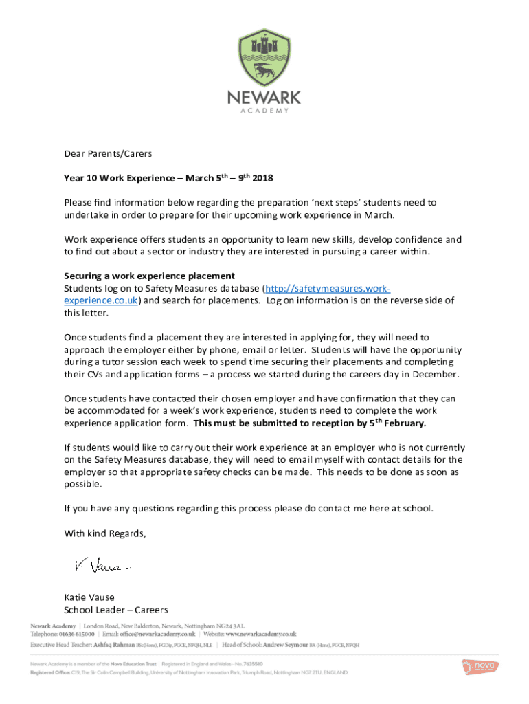 Get the free Dear Parents/Carers Year 10 Work Experience March 5th