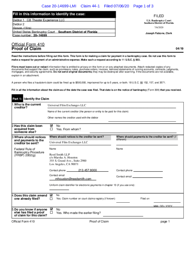 Case 2014699LMIClaim 441Filed 07/06/20Page 1 of 3Fill in this information to identify the case:FILEDDebtor 1 CB Theater Experience LLC