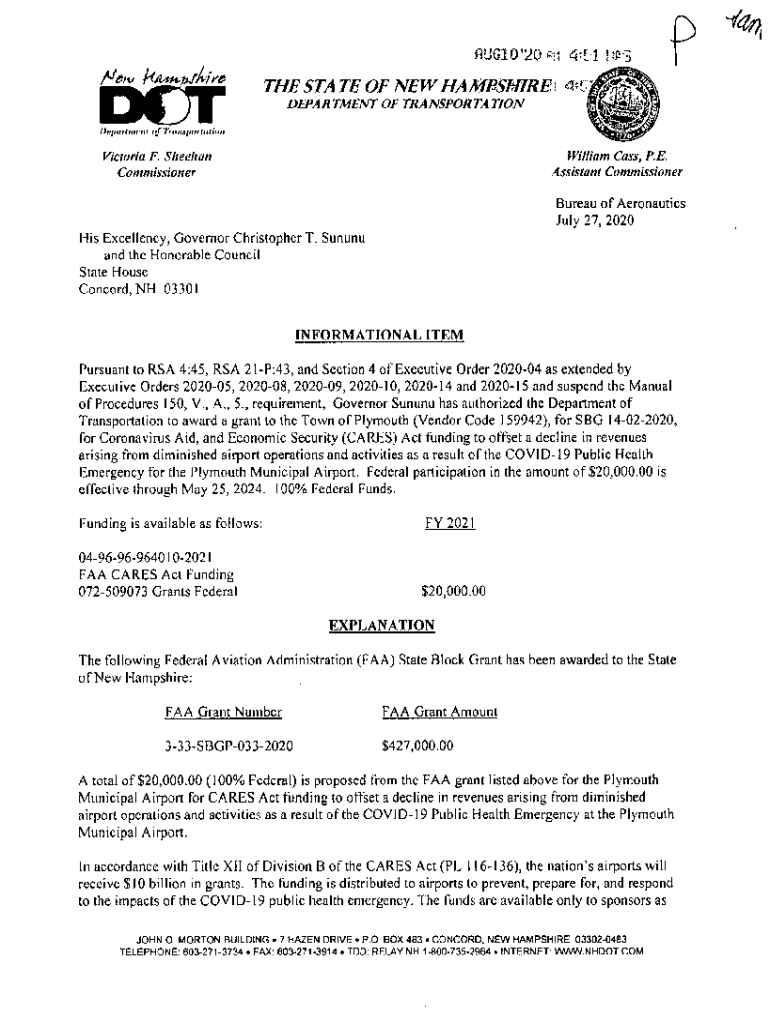 D flUG10\'20 in 4i lDC3tTHE STA TE OF New Hampshire!:HEPA R TRENT OF ERA NS POR TA T/NIH\'iiiirlini\'oil oflrniiiiiorlitliiinVictoria F. SheehanWilliam Class, P.E. CommissionerAssistant CommissionerBureau
