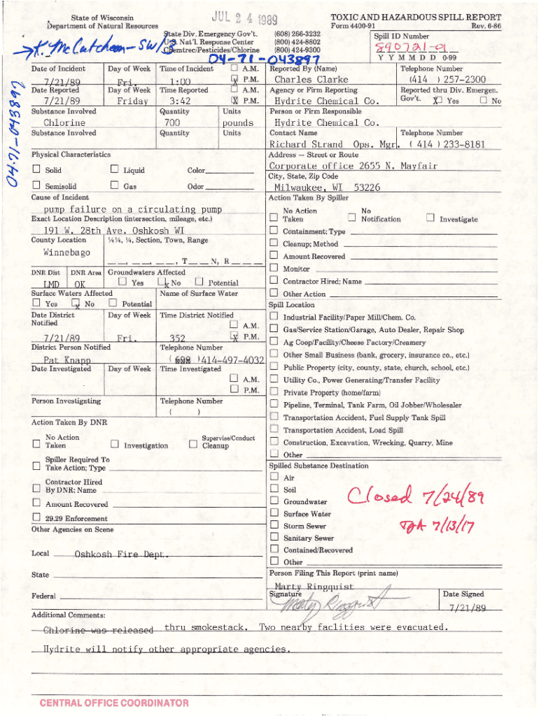 JUL 2 4 1989, State of Wisconsin l)department of Natural Resources J late Div. Emergency Gov\'t. . Nat\'l. Response Generate of Incident Day of Week7 /\')1 /Day of Week1 time ReportedFriday7/21 /89