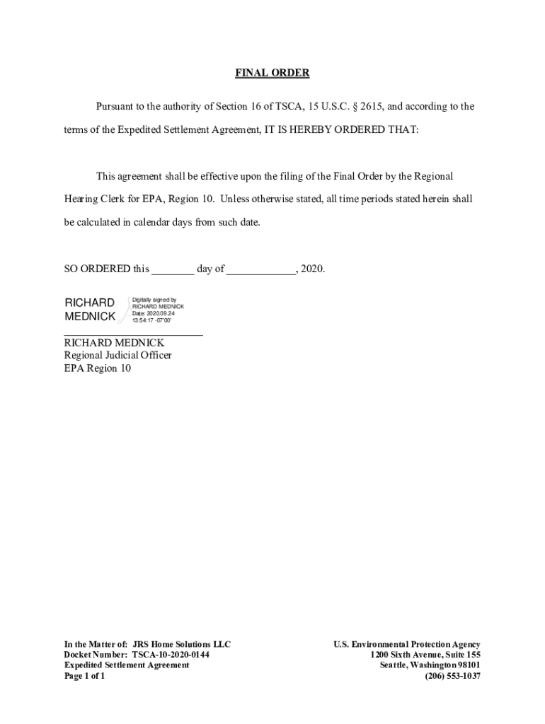 FINAL ORDER Pursuant to the authority of Section 16 of TSA, 15 U.S.C. 2615, and according to the terms of the Expedited Settlement Agreement, IT IS HEREBY ORDERED THAT:This agreement shall be effective