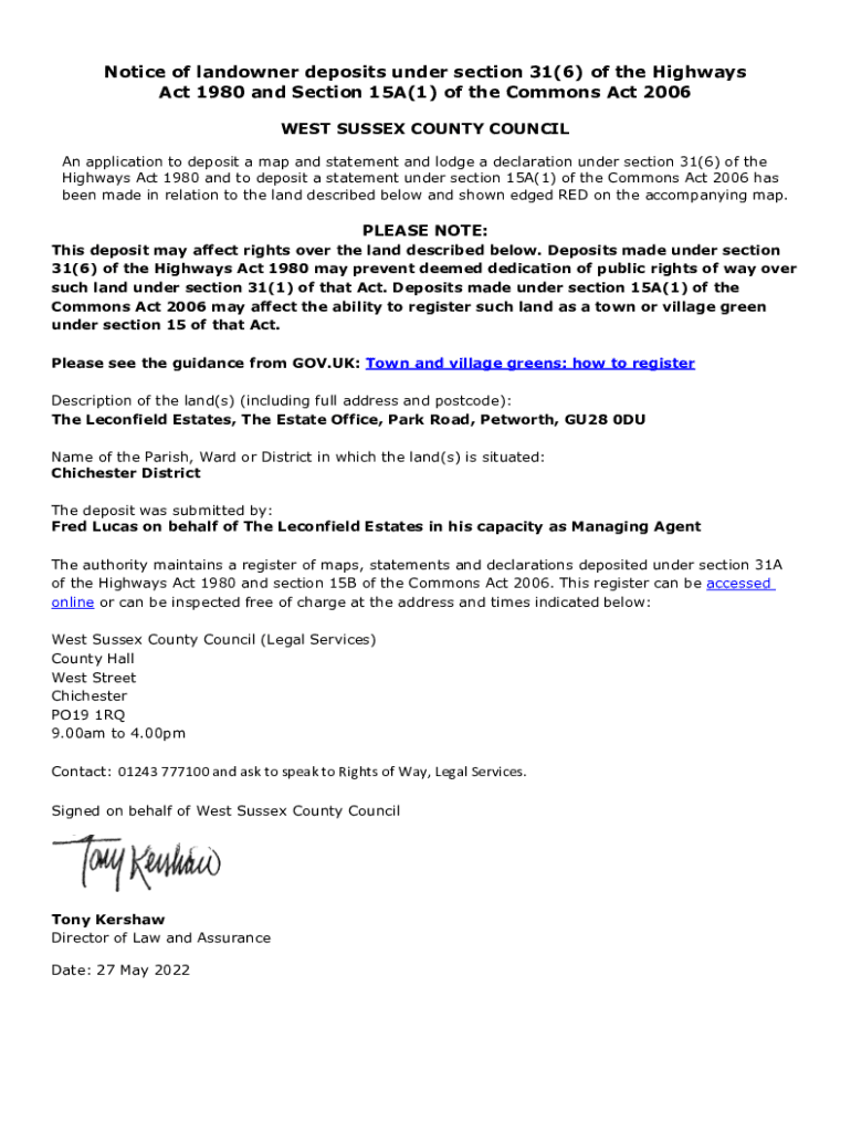 Notice of landowner deposits under section 31(6) of the Highways Act 1980 and Section 15A(1) of the Commons Act 2006 WEST SUSSEX COUNTY COUNCIL An application to deposit a map and statement and lodge