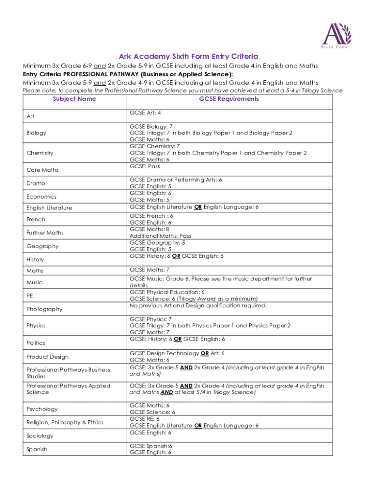 Ark Academy Sixth Form Entry Criteria Minimum 3x Grade 69 and 2x Grade 59 in GCSE including at least Grade 4 in English and Math Entry Criteria PROFESSIONAL PATHWAY (Business or Applied Science):