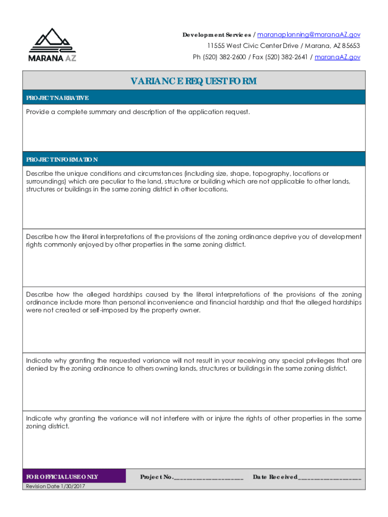 Development Services / maranaplanning@maranaAZ.gov 11555 West Civic Center Drive / Marina, AZ 85653 pH (520) 3822600 / Fax (520) 3822641 / Maranhão. Covariance REQUEST FORM PROJECT NARRATIVE Provide