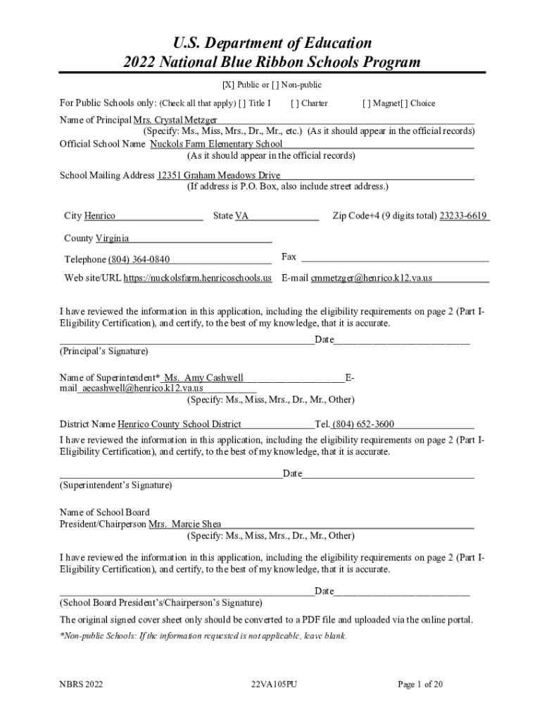 U.S. Department of Education 2022 National Blue Ribbon Schools Program [X] Public or [ ] Nonpublic Public Schools only: (Check all that apply) [ ] Title I[ ] Charter[ ] Magnet[ ] ChoiceName of Principal