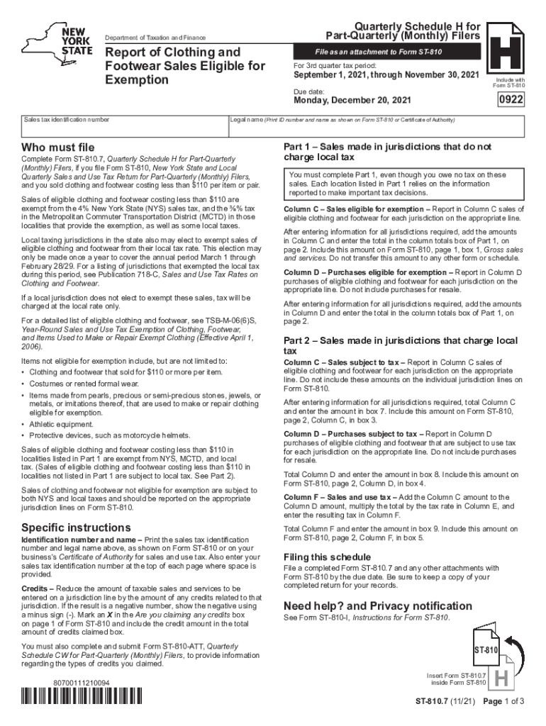 Quarterly Schedule H for PartQuarterly (Monthly) FilersDepartment of Taxation and FinanceReport of Clothing and Footwear Sales Eligible for ExemptionFile as an attachment to Form ST810For 3rd quarter