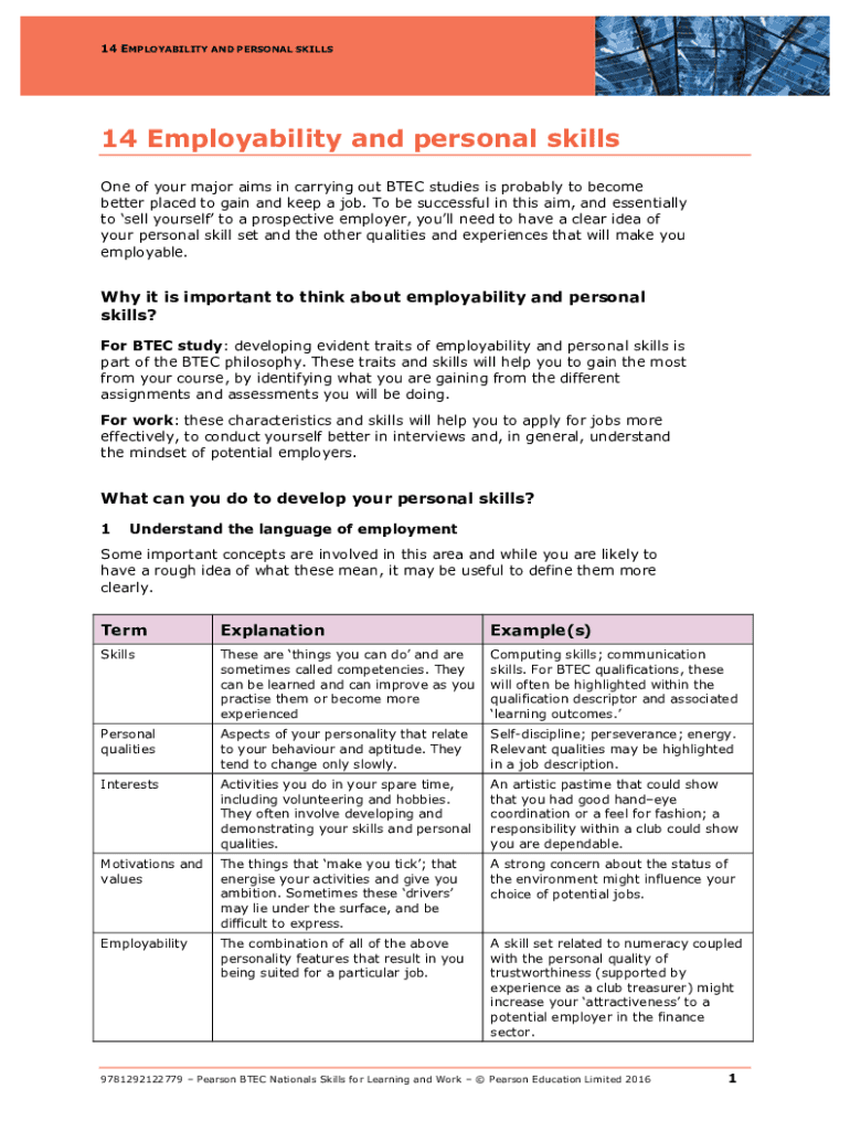 14 EMPLOYABILITY AND PERSONAL SKILLS14 Employability and personal skills One of your major aims in carrying out BTEC studies is probably to become better placed to gain and keep a job. To be successful