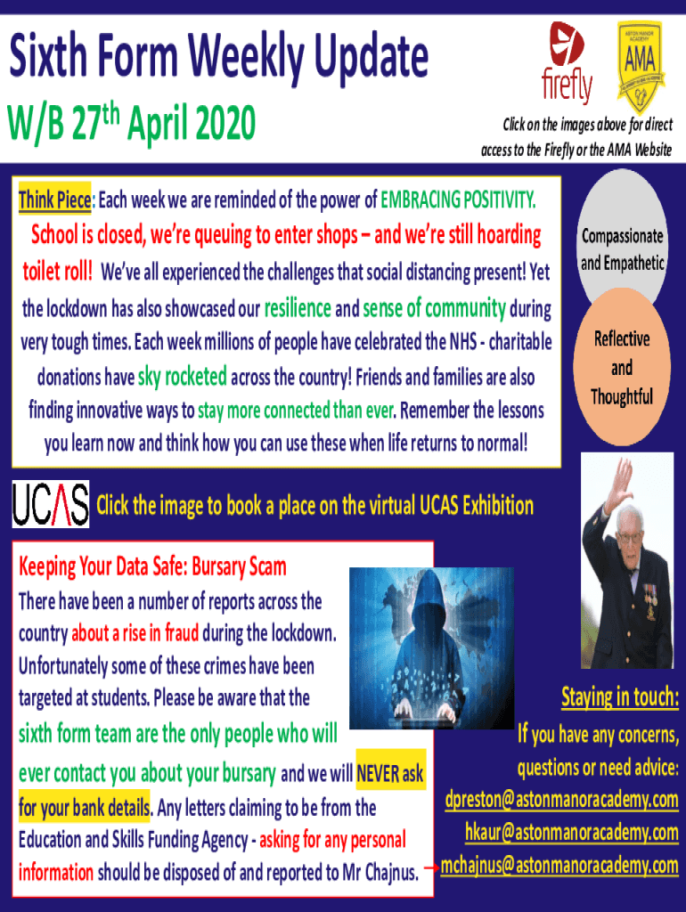 Sixth Form Weekly Update W/B 27th April 2020Click on the images above for direct access to the Firefly or the AMA WebsiteThink Piece: Each week we are reminded of the power of EMBRACING POSITIVITY.