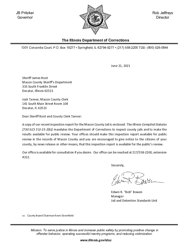 JB Pritzker Governor Rob Jeffrey's Directorate Illinois Department of Corrections 1301 Concordia Court, P.O. Box 19277 Springfield, IL 627949277 (217) 5582200 TDD: (800) 5260844June 21, 2021 Sheriff