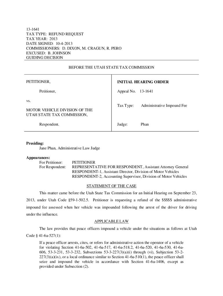 131641 TAX TYPE: REFUND REQUEST TAX YEAR: 2013 DATE SIGNED: 1042013 COMMISSIONERS: D. DIXON, M. CRAG UN, R. PRO EXCUSED: B. JOHNSON GUIDING DECISION BEFORE THE UTAH STATE TAX COMMISSIONPETITIONER,