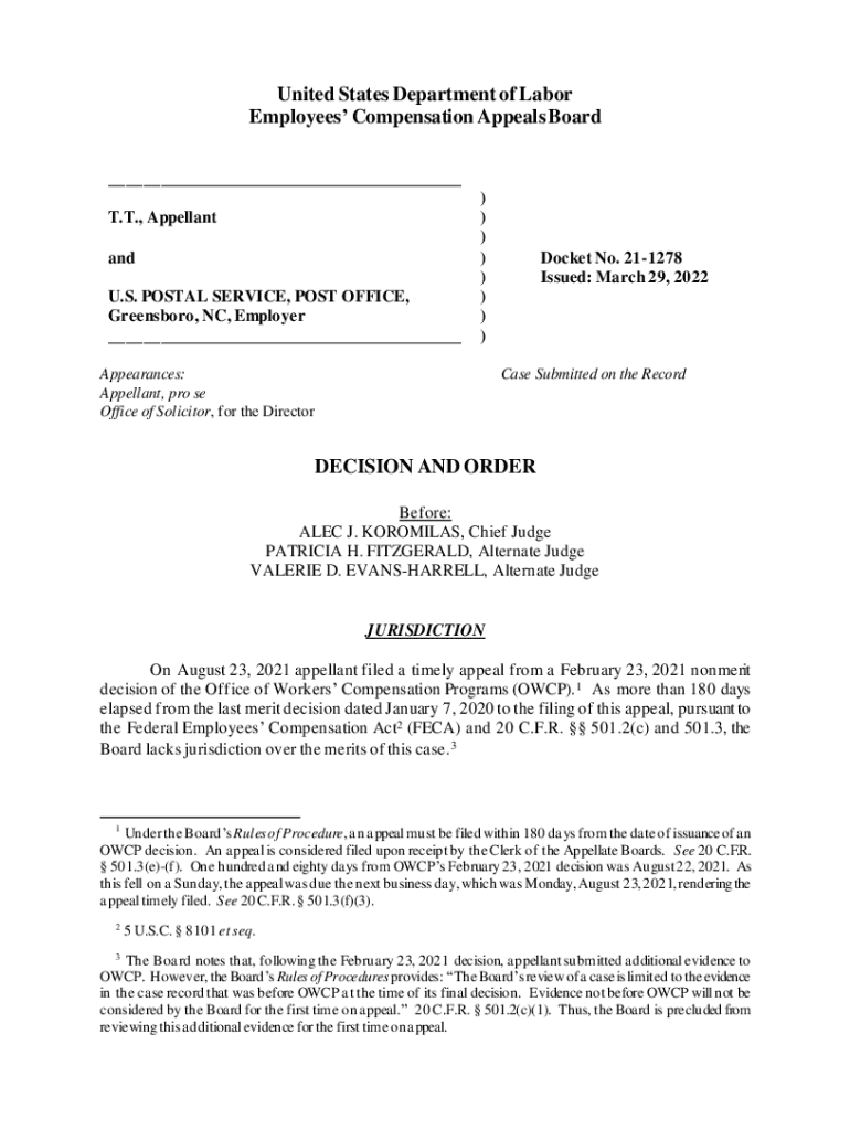 United States Department of Labor Employees Compensation Appeals Board ___ T.T., Appellant and U.S. POSTAL SERVICE, POST OFFICE, Greensboro, NC, Employer ___))))))))Appearances: Appellant, pro SE