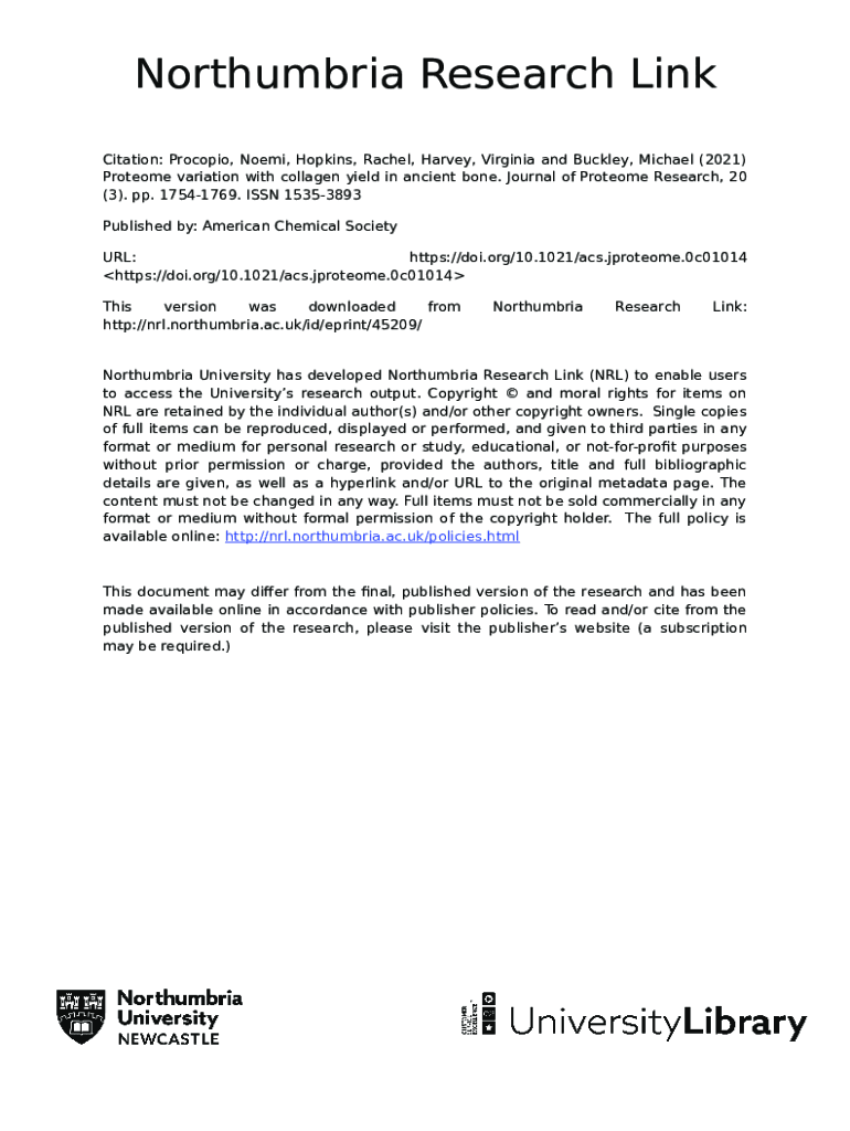 Northumbria Research Link Citation: Promotion, Noemi, Hopkins, Rachel, Harvey, Virginia and Buckley, Michael (2021) Protégé variation with collagen yield in ancient bone. Journal of Protégé Research,
