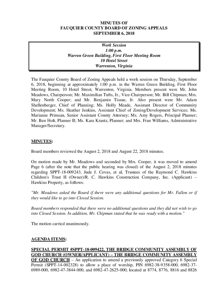 MINUTES OF FAULTIER COUNTY BOARD OF ZONING APPEALS SEPTEMBER 6, 2018, Work Session 1:00 p.m. Warren Green Building, First Floor Meeting Room 10 Hotel Street Warren ton, Virginia The Faultier County