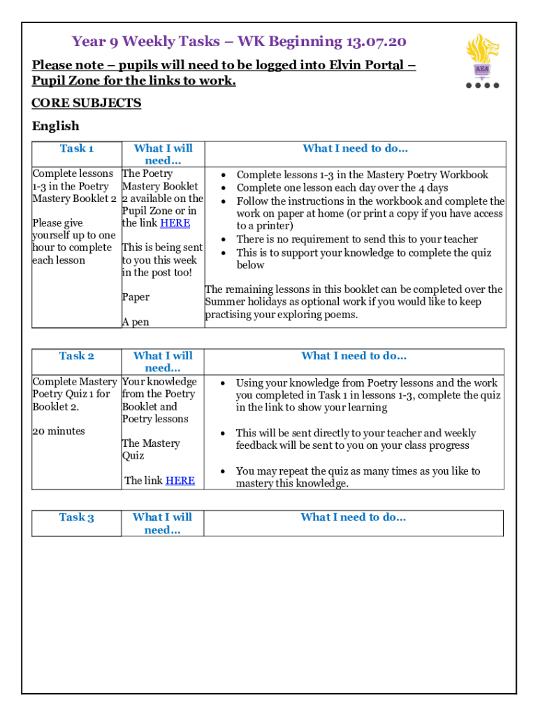 Year 9 Weekly Tasks WK Beginning 13.07.20 Please note pupils will need to be logged into Elvin Portal Pupil Zone for the links to work. CORE SUBJECTS English Task 1What I will need Complete lessons