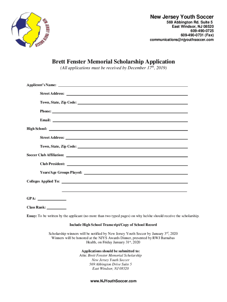 New Jersey Youth Soccer 569 Abington Rd. Suite 5 East Windsor, NJ 08520 6094900725 6094900731 (Fax) communications@njyouthsoccer.comBrett Fester Memorial Scholarship Application (All applications