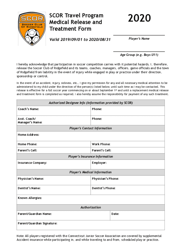 2020SCOR Travel Program Medical Release and Treatment Formulates NameValid 2019/09/01 to 2020/08/31Age Group (e.g. Boys U11) I hereby acknowledge that participation in soccer competition carries with