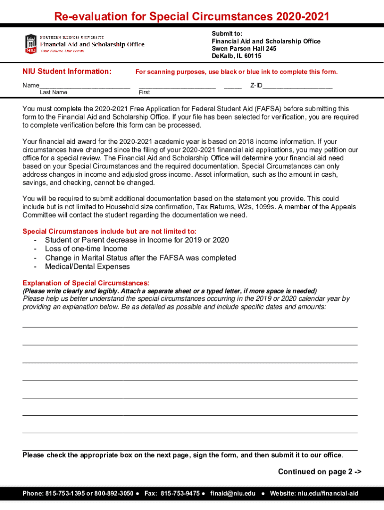 Reevaluation for Special Circumstances 20202021 Submit to: Financial Aid and Scholarship Office Seen Parson Hall 245 DeKalb, IL 60115NIU Student Information: Name___ Last Name scanning purposes, use