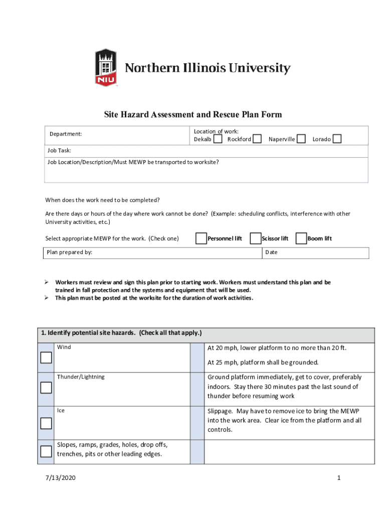 Site Hazard Assessment and Rescue Plan Form Department:Location of work: Dekalb RockfordNapervilleLoradoJob Task: Job Location/Description/Must MEW be transported to worksite? When does the work need