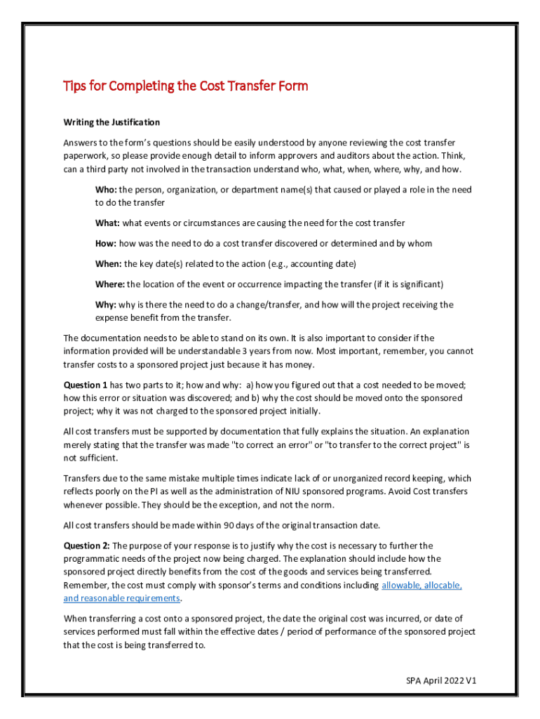 Tips for Completing the Cost Transfer Form Writing the Justification Answers to the forms questions should be easily understood by anyone reviewing the cost transfer paperwork, so please provide enough