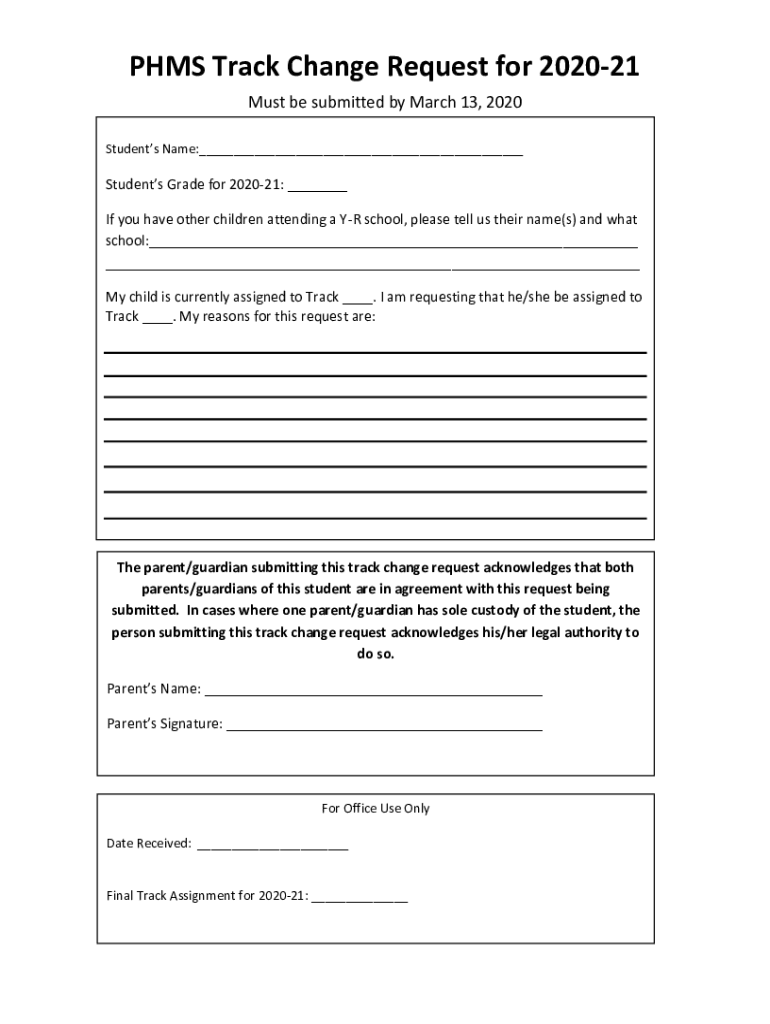 PMS Track Change Request for 202021 Must be submitted by March 13, 2020, Students Name:___Students Grade for 202021: ___ If you have other children attending a YR school, please tell us their name(s)
