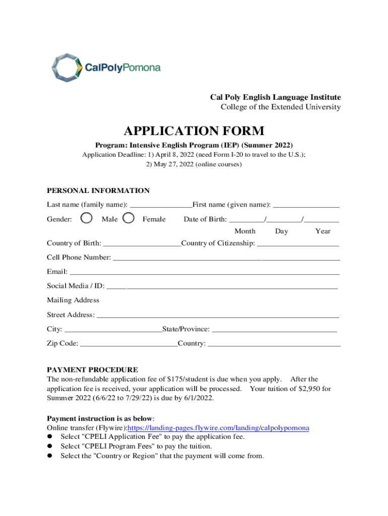 Cal Poly English Language Institute College of the Extended UniversityAPPLICATION FORM Program: Intensive English Program (IEP) (Summer 2022) Application Deadline: 1) April 8, 2022 (need Form I20