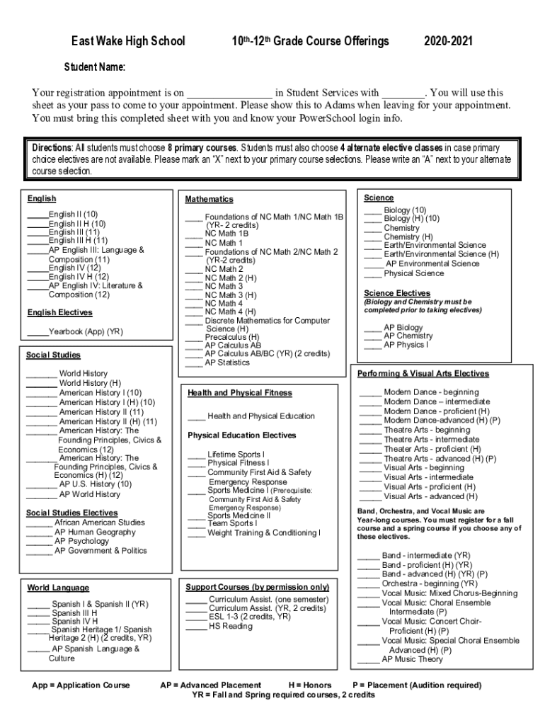 East Wake High School10th12th Grade Course Offerings20202021Student Name: Your registration appointment is on ___ in Student Services with ___. You will use this sheet as your pass to come to your