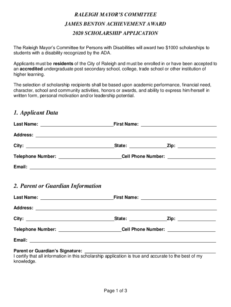 RALEIGH MAYORS COMMITTEE JAMES BENTON ACHIEVEMENT AWARD 2020 SCHOLARSHIP APPLICATION The Raleigh Mayors Committee for Persons with Disabilities will award two $1000 scholarships to students with a