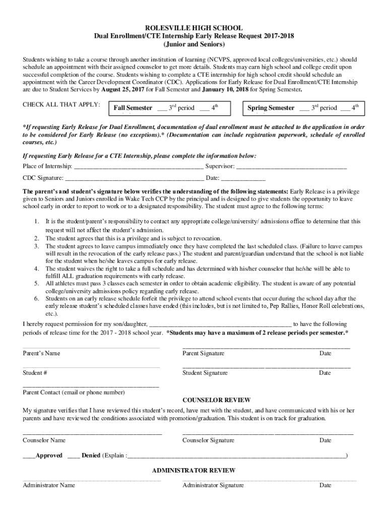 Get the free ROLESVILLE HIGH SCHOOL Dual Enrollment/CTE Internship Early Release ...