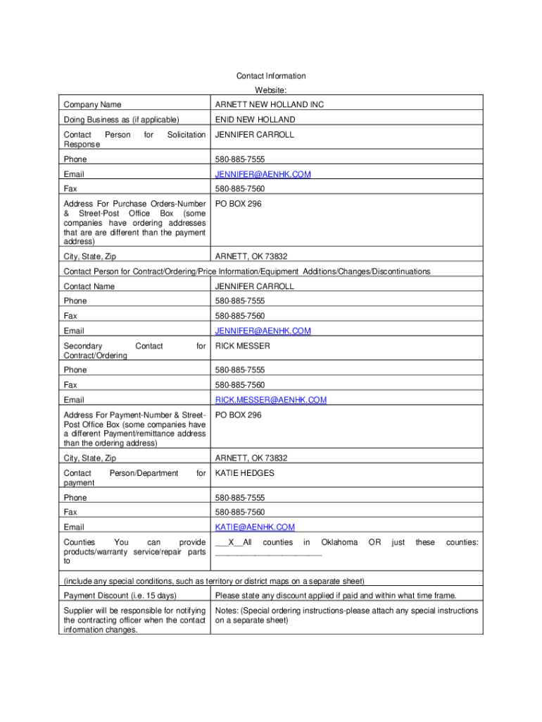 Contact Information Website: Company NameARNETT NEW HOLLAND Incoming Business as (if applicable)ENID NEW HOLLANDContact Person ResponseJENNIFER CARROLLforSolicitationPhone5808857555EmailJENNIFER@AENHK.COMFax5808857560Address