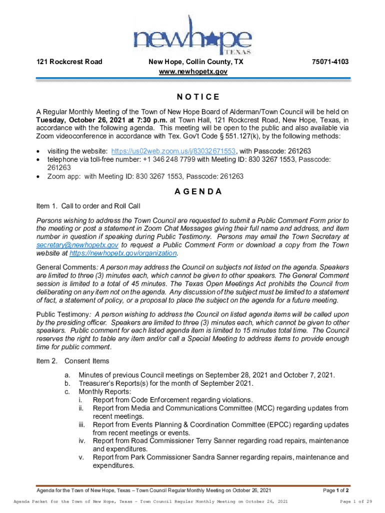121 Rock crest Rodney Hope, Collin County, TX www.newhopetx.gov750714103NOTICE A Regular Monthly Meeting of the Town of New Hope Board of Alderman/Town Council will be held on Tuesday, October 26,