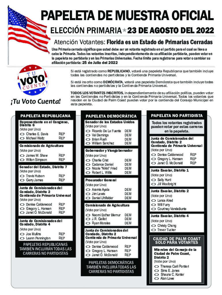 The official sample ballot papeleta must include the names of all candidates running for office, as well as any proposed laws or measures that will be voted on.