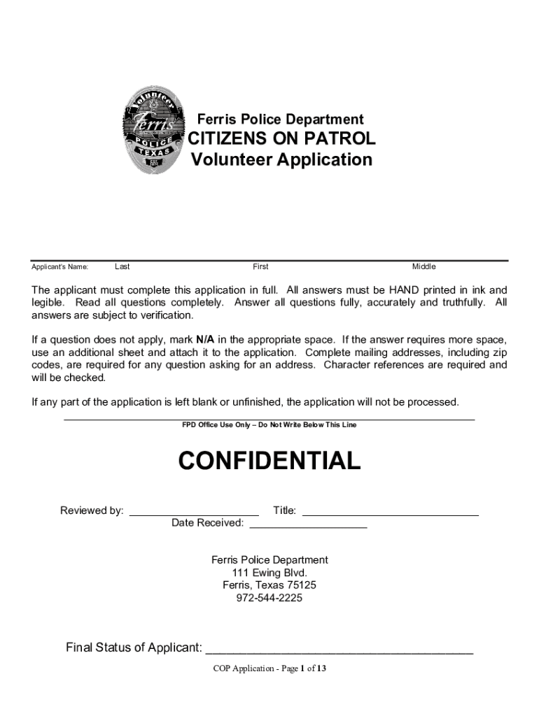 Ferris Police DepartmentCITIZENS ON PATROL Volunteer ApplicationApplicants Name:LastFirstMiddleThe applicant must complete this application in full. All answers must be HAND printed in ink and legible.