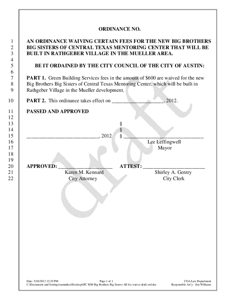 ORDINANCE NO. 1 2 3 4 5 6 7 8 9AN ORDINANCE WAIVING CERTAIN FEES FOR THE NEW BIG BROTHERS BIG SISTERS OF CENTRAL TEXAS MENTORING CENTER THAT WILL BE BUILT IN RATHER VILLAGE IN THE MUELLER AREA. BE
