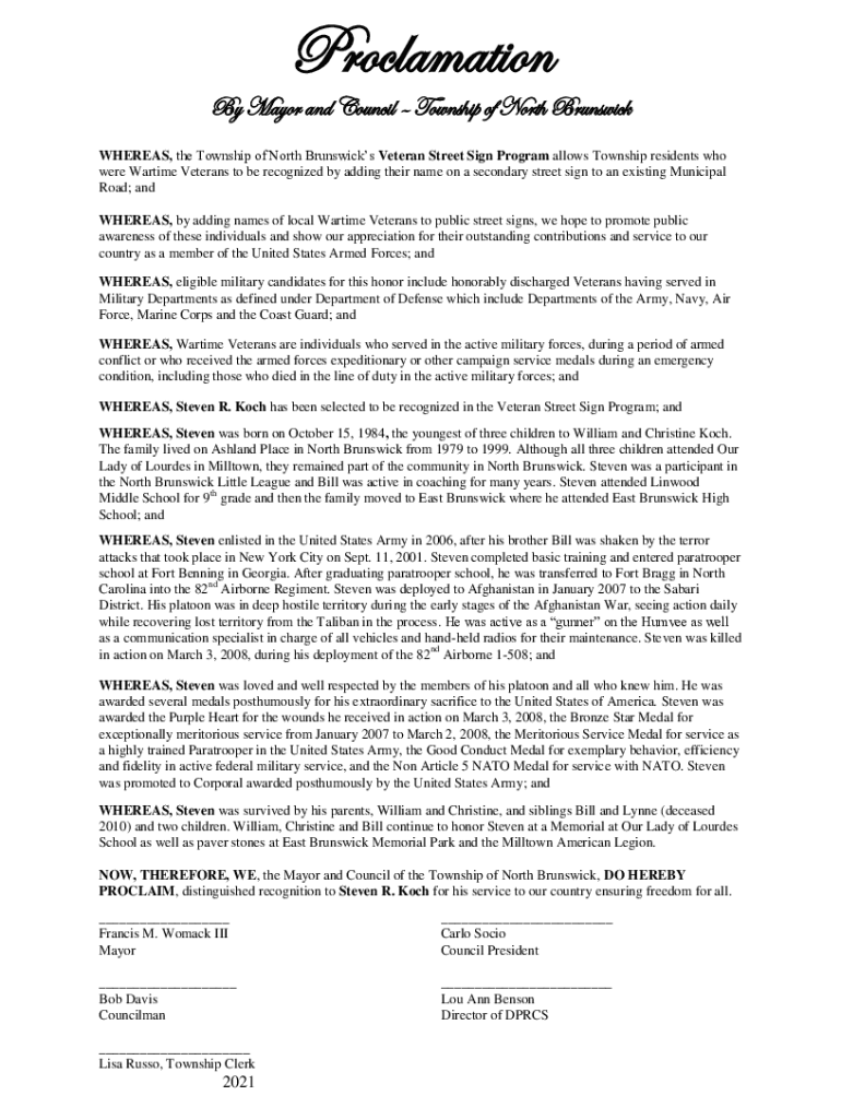 Proclamation Mayor and Council Township of North Brunswick WHEREAS, the Township of North Brunswick's Veteran Street Sign Program allows Township residents who were Wartime Veterans to be recognized