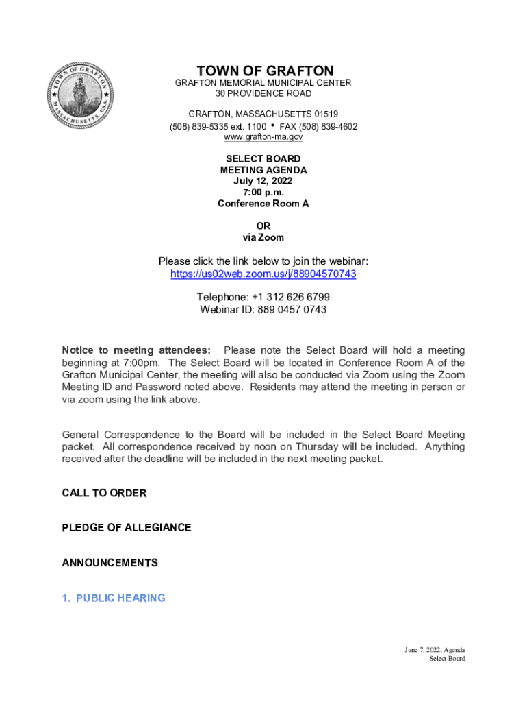 TOWN OF GRAFTONGRAFTON MEMORIAL MUNICIPAL CENTER 30 PROVIDENCE ROAD GRAFTON, MASSACHUSETTS 01519 (508) 8395335 ext. 1100 FAX (508) 8394602 www.graftonma.govSELECT BOARD MEETING AGENDA July 12, 2022