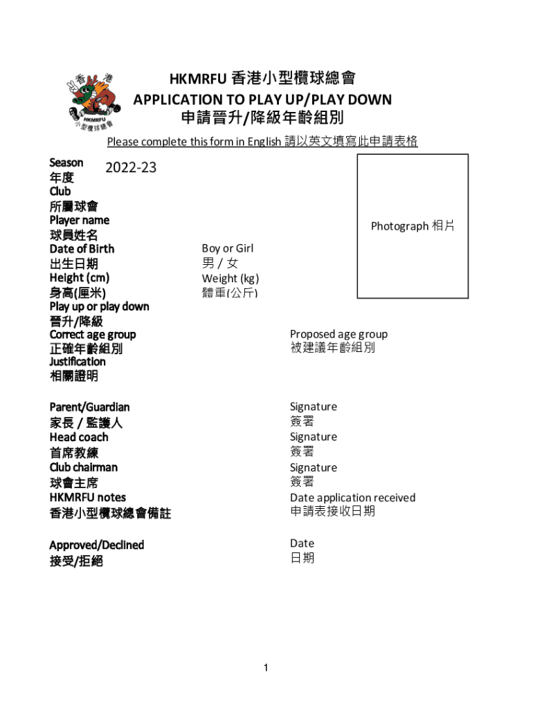CORFU APPLICATION TO PLAY UP/PLAY DOWN / Please complete this form in English Season 202223 Club Player name Date of Birth Height (cm) () Play up or play down / Correct age group Justification Photograph