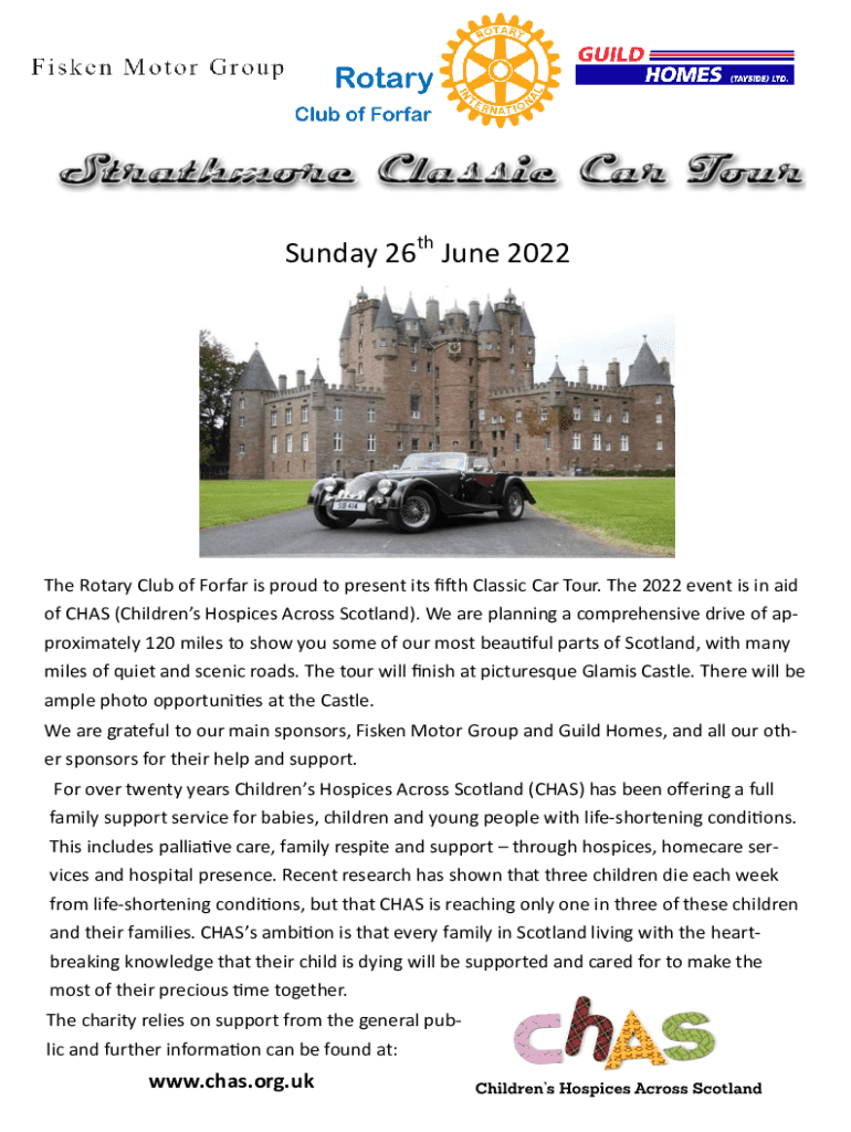 Sunday 26th June 2022The Rotary Club of Forfeit is proud to present its fifth Classic Car Tour. The 2022 event is in aid of HAS (Children's Hospices Across Scotland). We are planning a comprehensive