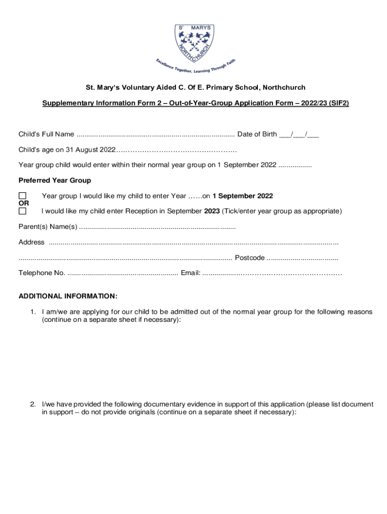Supplementary Information Form 2 OutofYearGroup Application Form 2022/23 (SIF2)Child's Full Name ................................................................................