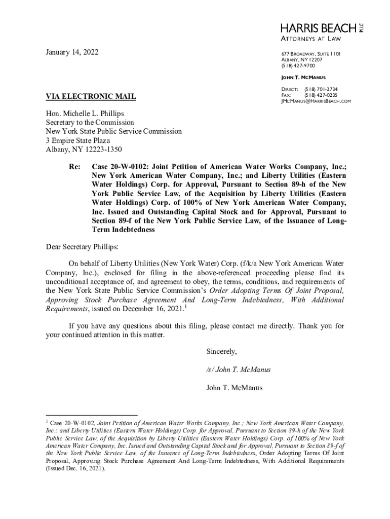 January 14, 2022677 BROADWAY, SU ITE 1101 A ALBANY, NY 12207 (518) 4279700 J ON T. M CMA NUS DIRECT: (518) 7012734 F AX : (518) 4270235 JC MANUS@HARRIS B EACH. COMIC ELECTRONIC MAIL Hon. Michelle