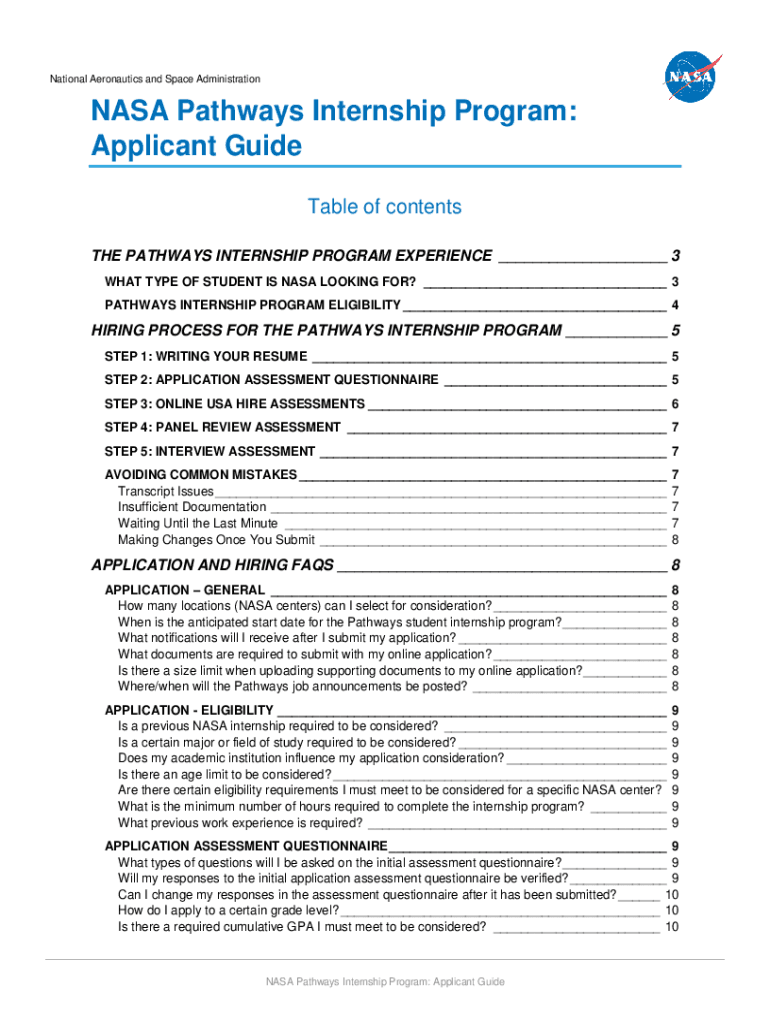 National Aeronautics and Space Administration NASA Pathways Internship Program: Applicant Guide Table of contents THE PATHWAYS INTERNSHIP PROGRAM EXPERIENCE ___ 3 WHAT TYPE OF STUDENT IS NASA LOOKING