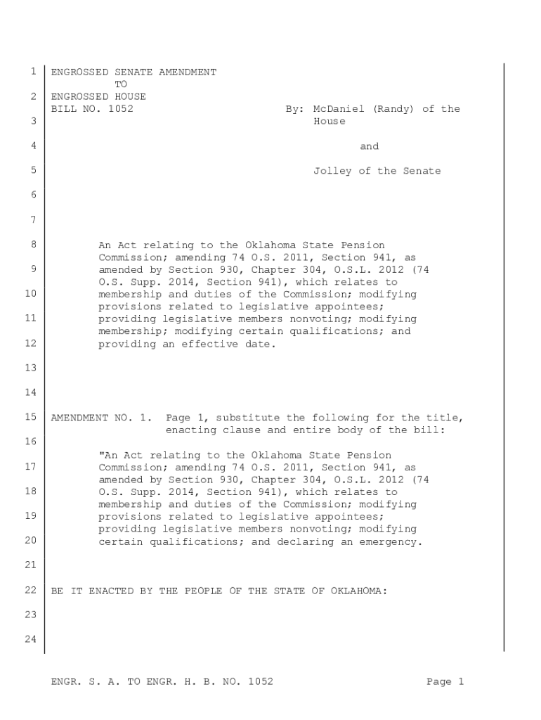 1 2ENGROSSED SENATE AMENDMENT TO ENGROSSED HOUSE BILL NO. 10523 4By: McDaniel (Randy) of the House and5Jolley of the Senate6 7 8 9 10 11 12An Act relating to the Oklahoma State Pension Commission;