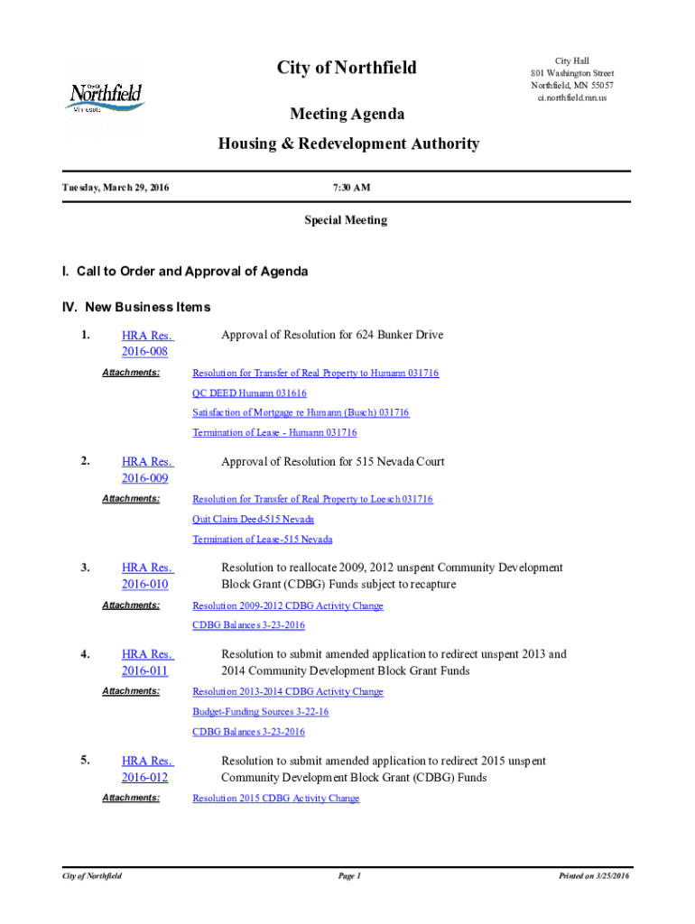 City of NorthfieldCity Hall 801 Washington Street Northfield, MN 55057 CI. Northfield.MN.meeting Agenda Housing & Redevelopment Authority Tuesday, March 29, 20167:30 Special Meeting. Call to Order