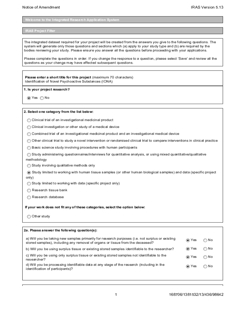 Notice of Amendment IRAS Version 5.13Welcome to the Integrated Research Application System IRAS Project Filter The integrated dataset required for your project will be created from the answers you