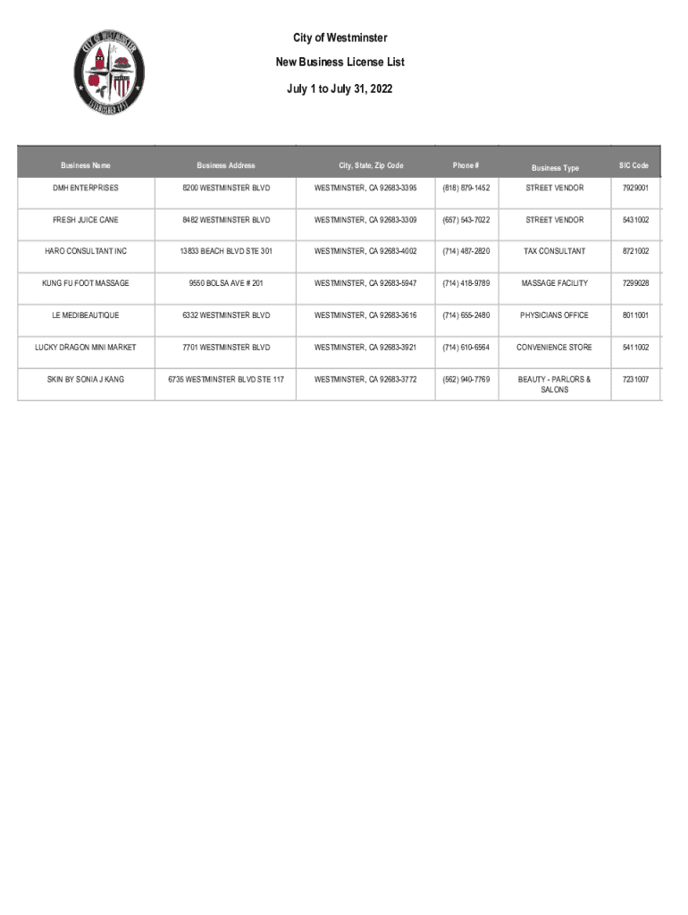 July 1 to July 31, 2022Business NameBusiness Address ENTERPRISES8200 WESTMINSTER BLVDFRESH JUICE Capacity, State, Zip Telephone #Business Type SIC CodeWESTMINSTER,
