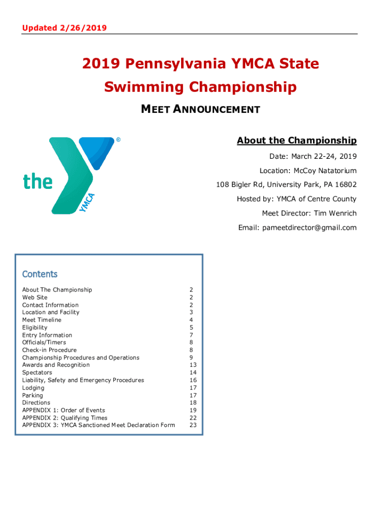 Updated 2/26/20192019 Pennsylvania YMCA State Swimming Championship MEET ANNOUNCEMENT About the Championship Date: March 2224, 2019 Location: McCoy Sanatorium 108 Bigger Rd, University Park, PA 16802