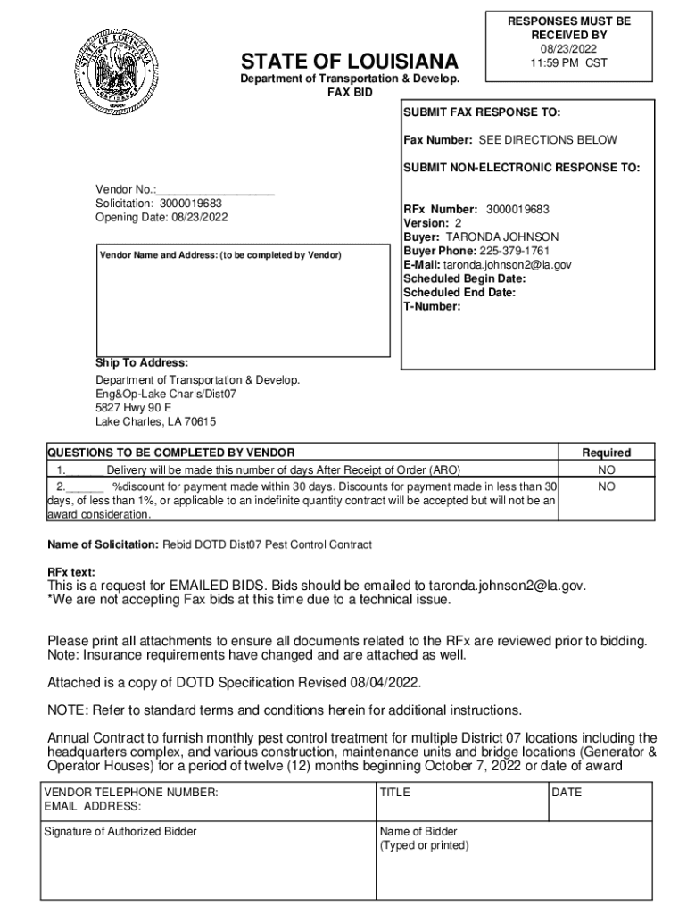 STATE OF LOUISIANARESPONSES MUST BE RECEIVED BY 08/23/2022 11:59 PM Department of Transportation & Develop. FAX BID SUBMIT FAX RESPONSE TO: Fax Number: SEE DIRECTIONS BELOW SUBMIT NONELECTRIC RESPONSE