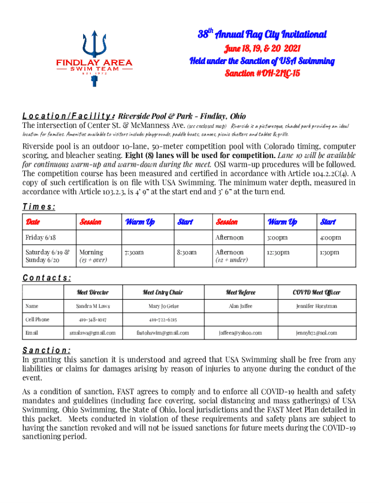 38t Annual Fla Cit Invitation Jun 18, 19, & 20 2021 HEL under TH Sanction of the USA Swimming Sanction #OH21LC15 L o c a t i o n / F a c i l i t y : Riverside Pool & Park Findlay, Ohio The intersection